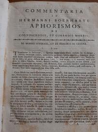 Opera Commentaria in Omnes Aphorismos Hermanni Boerhaave, commentata da Gerardi B. De Van-Swieten, Volume Tomus Tertius (Tomo III) in lingua Latino. Anno di Stampa 1775, Editore Jo. Baptiste Pasquali di Venezia (Venetiis). La rilegatura è rigida, invecchiata, probabile pergamena o cartonato rustico. Il Dorso del libro è danneggiato come si vede in foto. Le pagine sono un pò ingiallite, con fioriture (macchie da umidità e tempo), tipiche di un volume del '700. (No manoscritto)