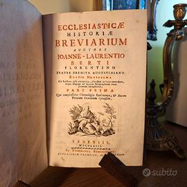 BREVARIO DI STORIA ECCLESIASTICA Sintesi della storia ecclesiastica, nello specifico la "Pars prima" (Parte prima) che comprende i rudimenti della cronologia e la sinossi dei primi dieci secoli. Autore: Giovanni Lorenzo Berti, frate eremita agostiniano Provenienza: Italia Periodo: XVIII SEC. Anno di pubblicazione e Luogo: 1763 Venezia Edizione: Edizione nuova, Tomo 1 Editore: Famiglia Remondini, celebre per la sua vasta produzione editoriale e per le sue stampe di alta qualità, operava principalmente a Bassano del Grappa e gli uffici erano ubicati a Venezia. Lingua: Latino N. Pagine: 260 Materiale Rilegatura: Pergamena Misure libro: 13x19 cm In ottime condizioni, presenta lievi segni del tempo. Rilegatura in ottimo stato non danneggiata. Spedizione con assicurazione Per qualsiasi informazione non esitate a chiedere