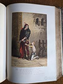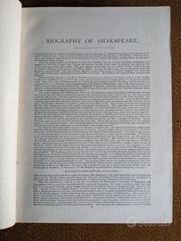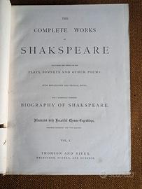 “ The complete works of Shakespeare including the whole of his plays, sonnets and other poems with explanatory and critical notes and a carefully compiled biography of Shakespeare illustrated with beautiful chromo-engravings”, Thomson and Niven, Melbourne, Sidney and Dunedin, circa fine ‘800, 2 volumi in uno; dimensioni: 23x30x8cm; copertina rigida blu con decoro dorato, staccata; vol I con 422 pagine (biography of Shakespeare; The tempest; Two gentlemen of Verona; Merry wivs of Windsor; Romeo and Juliet; As you like it; Macbeth…), vol. II con 441 pagine; condizioni discrete