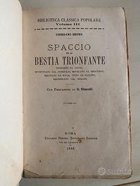 Raro libro antico 1888 Giordano Bruno “Spaccio della Bestia Trionfante”. Prefazione di Giacinto Stiavelli. Cm.18x10,7., pagine 212. Collezione "Biblioteca classica per il popolo", n°3. Opera di argomento filosofico data alle stampe a Londra nel 1584, lo "Spaccio de la bestia trionfante" è un testo allegorico di ispirazione antiprotestante. Condizioni come da foto, si è staccato un pezzo dalla costa (foto della costa) per maggiori informazioni contattatemi!