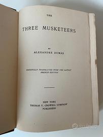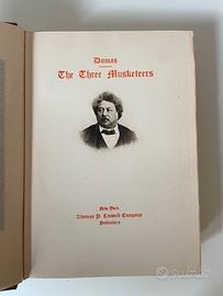 Libro antico "The Three Musketeers" di Alexandre Dumas pubblicato da Thomas Y. Cromwell & Company a New York nel 1901, versione in inglese de "I Tre Moschettieri", copertina rigida con illustrazione, all'interno tavole in bianco e nero, dimensioni 21x15cm.