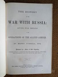 “The history of the war with Russia” by Henry Tyrrell, illustrated by a series of steel engravings, London and New York 1855 c.; 3 volumi (vol. I 384 pagine con 33 tavole; vol. II 380 pagine con alcune tavole mancanti; vol. III 338 pagine con 13 tavole); dimensioni: 20x28cm ogni volume; bordo leggermente staccato.