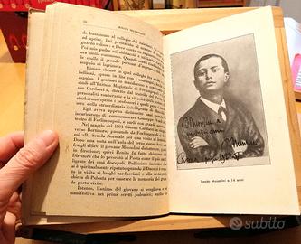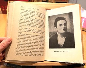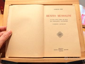 Libro scritto da Giorgio Pini, "Benito Mussolini-La sua vita fino ad oggi-Da Predappio all'Impero", edizione Cappelli-Bologna del 1938. Formato 13 cm x 19 cm, copertina flessibile, 136 pagine, fotografie in bianco e nero. Pagine ingiallite dal tempo, ma condizioni generali ottime. Sulla prima pagina è presente la firma del precedente proprietario del libro.