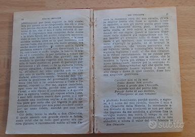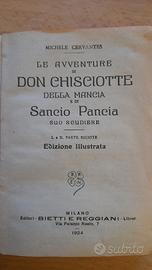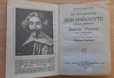 Edizione d'epoca del capolavoro di Miguel de Cervantes (Michele Cervantes), pubblicato a Milano nel 1924 dalla casa editrice Bietti e Reggiani. Edizione che riunisce la Parte I e la Parte II de " Le Avventure di Don Chisciotte della Mancia e di Sancio Pancia suo scudiero". Anno 1924 Edizione centenaria, illustrata con incisioni d'epoca (incluso il ritratto dell'autore in antiporta). Copertina rigida in tela rossa con eleganti fregi e scritte in rilievo oro.