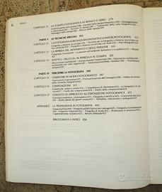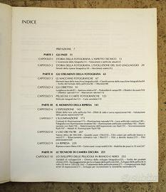 Splendida pubblicazione illustrata edita da Zanichelli, dal grande formato il cui argomento principale, come da titolo è “la fotografia”. La 1a parte dell'opera inizia con la storia della fotografia, il suo aspetto tecnico e l'evoluzione del suo linguaggio. Continua con la 2a parte in cui sono analizzati gli strumenti della fotografia, le macchine fotografiche ed gli obbiettivi, compreso le pellicole e le carte fotografiche. Nella 3a parte viene preso in esame il momento della ripresa, l'esposizione, l'illuminazione e l'uso dei filtri. La 4a parte dell'opera affronta l'argomento riguardante le tecniche della camera oscura, lo sviluppo delle pellicole in bianco e nero e la stampa fotografica in bianco e nero. Proseguono le tecniche speciali nella 5a parte ed esattamente la fotografia a distanza e la macrofotografia, la ripresa del movimento e delle persone, gli effetti e “trucchi” in ripresa e in stampa. La 6a e ultima parte viene affrontato il tema: percepire la fotografia e cioè osservare in modo fotografico, la composizione, concetti di approccio all'esposizione fotografica e infine la professione in fotografia.