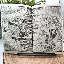 Titolo: 新局九尾傳 (Shinkyoku Kyūbi-den) La Nuova Canzone della Volpe a Nove Code Autore: 為永 春水 (Tamenaga Shunsui È considerato il maestro indiscusso del genere Ninshōbon (romanzi sentimentali del periodo Edo) Illustratore: 歌川 國貞 (Utagawa Kunisada) (noto anche come Toyokuni III) Kunisada è stato l'artista di ukiyo-e più prolifico e di successo commerciale della sua generazione, superando in popolarità persino contemporanei come Hiroshige e Kuniyoshi. Editore: 蔦屋吉蔵 (Tsutaya Kichizō) Anno: 明治三年(3° anno dell'era Meiji - 1870) Genere: Genere: Gōkan (合巻), libri illustrati popolari caratterizzati da testo intrecciato con xilografie elaborate. Descrizione: L'opera è una rivisitazione della celebre leggenda di Tamamo-no-Mae, la temibile volpe a nove code che si traveste da bellissima donna per sedurre l'imperatore e portare rovina al regno. Questa versione specifica appartiene al genere Kusazōshi e mescola elementi storici con il folklore soprannaturale, concentrandosi sugli intrighi di corte e sulle battaglie magiche necessarie per smascherare e sconfiggere lo spirito maligno.