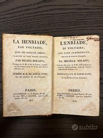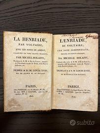 Vendo volume antico di inizio Ottocento: La Henriade / L’Enriade di Voltaire, edizione bilingue francese–italiano pubblicata a Parigi nel 1816 da Fayolle, Rey e Gravier. Si tratta di una traduzione in versi italiani di Michele Bolaffi, con note compendiate. Opera dedicata a S.M. Luigi XVIII, Re di Francia e di Navarra.