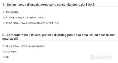 libro dei test per il conseguimento dell'esame Droni Uas A1/A3 ENAC aggiornato 2026, quaranta prove d'esame composte da quaranta domande ciascuna. I test sono aggiornati con le banche dati utilizzate per le sessioni d'esame e riguardano le seguenti materie: Regolamentazione Aeronautica Sicurezza Aerea Riservatezza e protezione dei dati Conoscenza generale dell’UAV Definizioni Limitazioni delle prestazioni umane Limitazioni dello spazio aereo Assicurazioni Procedure operative Security per info contattatemi!