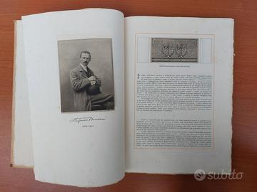 pp. 12 nn. di testo su carta a mano, vergata e filigranata (la filigrana presenta la scritta Roma e la lupa che allatta Romolo e Remo), legatura editoriale p. pergamena rigida con titolo in oro entro filettatura dorata e unghie. Titolo in oro su tassello in pelle rossa al dorso. Interamente illustrato con tavv. a colori e in b.n. applicate sia n.t. che f.t. Timbro di possesso della privata biblioteca del celebre poeta, scrittore e critico Enrico Thovez. Magnifica copia in barbe. Prima e unica edizione, rara. Monografia superbamente impressa, edita in occasione della mostra postuma delle opere del Bersani nel Palazzo della Società per le Belle Arti ed Esposizione Permanente in Milano.