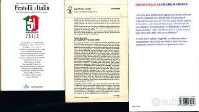 SCHEDA DEL LOTTO Titolo: Lotto 5 Volumi - Saggistica, Politica e Società Categoria: Saggistica / Politica Condizione: Buono stato generale Prezzo del lotto: 15,00 € (Indivisibile) Si propone in vendita un interessante blocco di 5 saggi su attualità, inchieste e storia (Deaglio, Barrese, MicroMega, ecc.). ELENCO DEI VOLUMI: E. Deaglio - La felicità in America (Feltrinelli) AAVV - Fratelli d'Italia (Mondadori) AAVV - MicroMega 7/2013 Pollari, del Cioppo - Combattere "cosa nostra" (Buffetti) O. Barrese - Un complotto nucleare (Newton Compton) Condizioni buone: i titoli recenti sono ottimi, quelli degli anni '80/'90 presentano il normale ingiallimento del tempo. Spedizione tempestiva e tracciata. (Peso del lotto: 1,4 kg).
