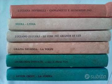 Vendo lotto di 14 romanzi pubblicati negli anni Sessanta. Con clamoroso refuso sul nome di Anton Čechov. Edizioni Arnoldo Mondadori, Mondiali, Industrie grafiche Cino Del Duca e Barion. Tra gli autori, Verga, Giacosa, Pirandello, Deledda e, appunto, Čechov. Il cui nome, sul dorso del volume, è indicato senza H e, all'interno, nella versione corretta. Seppure senza accento. Il lotto comprende anche un saggio illustrato, sulla prima guerra mondiale. I libri sono ingialliti, vissuti, ma quasi tutti in ottime condizioni. Il più usurato è "Il fallo di una donna onesta", l'unico privo di copertina cartonata.