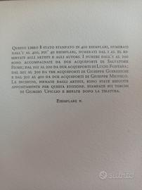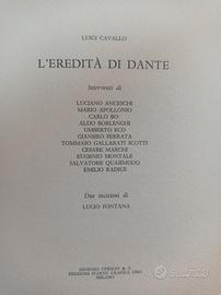 *LUCIO FONTANA (1899 / 1968)* (Pittore / Ceramista / Scultore Argentino naturalizzato Italiano) ************************* *L'EREDITÀ DI DANTE* LIBRO D'ARTISTA FACENTE PARTE DI UNA SERIE DI LIBRI D'ARTE ; COMPRENDE DUE (2) INCISIONI A COLORI ALL' ACQUATINTA DI LUCIO FONTANA (FIRMATE A DESTRA IN BASSO) ************************************* DESCRIZIONE : *ANNO DI PUBBLICAZIONE : 1966 *A cura di LUIGI CAVALLO *GIORGIO UPIGLIO & C. *EDIZIONE D'ARTE GRAFICA UNO MILANO *LEGATURA EDITORIALE RIGIDA MISTA ( IN PELLE CON DECORAZIONI GEOMETRICHE SUL DORSO, CARTONATO IN TUTTA TELA "VELLUTINO" COLOR GRIGIO IN 1^ E ULTIMA DI COPERTINA) *TITOLI IN COPERTINA E AL DORSO IMPRESSI A STAMPA IN ORO *COFANETTO EDITORIALE TUTTA TELA IN "VELLUTINO" GRIGIO *MISURA ACQUEFORTI : (cm. 21 x 16) *FORMATO IN 8° : (cm. 22 x 16,5) *PAGINE NUMERATE : 83 *LA COMPOSIZIONE DELL' OPERA DEL SEGUENTE LIBRO D'ARTISTA PREVEDE LA NUMERAZIONE IN TIRATURA LIMITATA DAL N° 101 AL N° 200 (100 ESEMPLARI NUMERATI) *QUESTA COPIA ESSENDO APPARTENUTA AGLI AUTORI, EDITORI NON E' CONTRASSEGNATA DA NUMERAZIONE *REPERIBILITÀ MOLTO RARA* ******************************** *CONSEGNA E RITIRO A MANO IN ZONA (BS / CR) •DA DEFINIRSI•