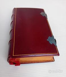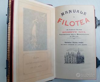 Riva Giuseppe, Manuale di filotea del Sacerdote Milanese Giuseppe Riva Penitenziere nella Metropolitana di Milano. (Il termine filotea, amica di dio, coniato al femminile da san Francesco di Sales dove un'immaginaria "Filotea" rappresenta tutte le persone che vogliono amare Dio, e dunque essere devote). Nuovissima ed. riveduta col nuovo catechismo ed altre aggiunte. Ed. Figli di Angelo Betti Milano Imprimatur: Mediolani, postr. Kal. Quint. 1901, In-24° (cm. 15,5x9,5x4), legatura t.pelle bordò con fermagli metallici, riquadrature in oro ai piatti ed al dorso, titoli al dorso con quattro nervature, tagli dorati, sguardie in seta rossa, nastro segnapagina, immagine in anteporta, frontespizio in rosso/nero, pp. VIII-1018 , ottime condizioni. Difetti: leggeri graffi alla pelle dei piatti.