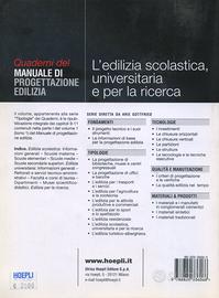Il volume affronta in dettaglio l'edilizia scolastica, universitaria e per la ricerca, articolando la trattazione di ciascun capitolo in informazioni generali seguite dalle tipologie relative all'ambito specifico trattato. Il volume è completato da riferimenti normativi aggiornati.