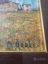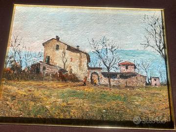 Raffinato dipinto a olio su tavola (o cartone telato) del maestro bresciano Martino Dolci (1912-1994). L'opera rappresenta uno dei temi più iconici della sua produzione: il paesaggio rurale. Con una pennellata materica e decisa, l'artista immortala un antico casolare immerso in un'atmosfera sospesa e poetica, tipica delle valli o della bassa bresciana. La luce, vibrante e naturale, conferisce al dipinto una profondità rara, rendendolo un pezzo di grande valore decorativo e collezionistico.