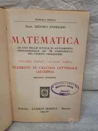 Vendo libro Matematica del professor Isidoro Andreani - Volume terzo, classe terza ,elementi di calcolo letterale (Algebra) - Seconda Edizione N° 453 - Copertina Rigida Cartonato - Editore Ulrico Hoepli Milano - Novembre 1933 - Pagine 74 - Biblioteca Tecnica Operai Fabbrica Officine Meccaniche G. Landini e Figli
