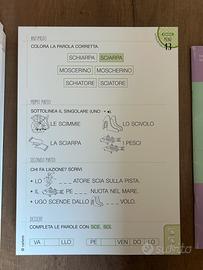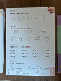 Schede su 4 livelli di difficoltà e prove di verifica a partire dai prerequisiti della classe 1ª della scuola primaria e comprensive di tutta la progettazione di italiano per il primo anno. Poco utilizzate e quindi in condizioni impeccabili.