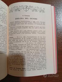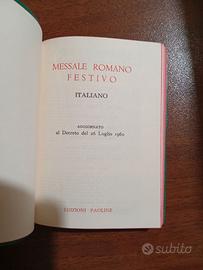 Vendo Messale Romano Festivo in italiano, edito da Edizioni Paoline, aggiornato al decreto del 26 luglio 1960. Libro liturgico cattolico vintage, in formato compatto, con copertina verde e croce impressa. Le pagine presentano bordi colorati (rosso/rosa) e includono testi in latino e italiano. Ottime condizioni generali Copertina integra con lievi segni del tempo Interno ben conservato, pagine leggibili e complete Formato tascabile, comodo da portare con sé. Ideale per collezionisti, appassionati di libri religiosi o oggetti liturgici d’epoca. Come da foto