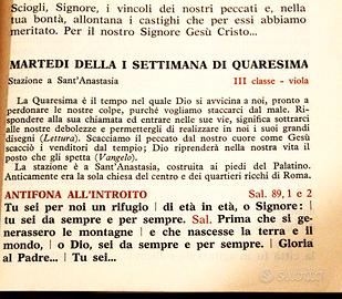 Messale Romano Quotidiano, libro liturgico della chiesa cattolica che contiene tutte le letture, le preghiere e i testi necessari per celebrare la messa Edizione 1966, pubblicato da Marietti (editori pontifici), a cura di Dom Gaspare Lefebvre O.S.B. e con edizione autorizzata dalla Conferenza Episcopale Italiana. 📌 Volume di grande fascino, ideale per: collezionisti di libri liturgici appassionati di storia della Chiesa e del periodo post-Concilio chi cerca un oggetto autentico e “vissuto” della spiritualità del ’900 Ritiro a mano a Milano o spedisco il giorno lavorativo successivo all'acquisto Ringrazio in anticipo chi lascerà feedback positivo 5 stelle che ricambierò prontamente