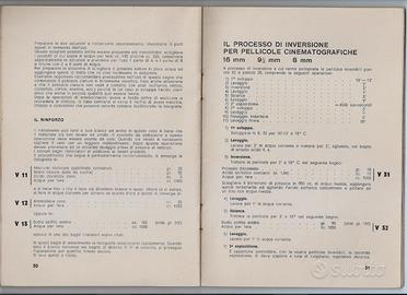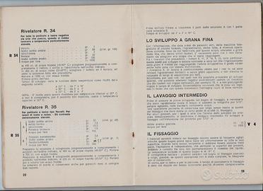 Nell'opuscolo sotto descritte le norme riguardanti i prodotti fotografici come lo sviluppo (l'integratore, diversi tipi di rivelatori) con parecchie formule chimiche di composizione per i più disparati tipi di pellicola, il fissaggio, i fissaggi rapidi, i fissaggi induritori con le relative formule chimiche. Si parla del trattamento per climi tropicali, delle operazioni correttive, del processo di inversione delle pellicole cinematografiche in 16, 9 1/2 , 8 mm., dei viraggi per le carte in seppia, bruno porpora, azzurro, rosso. Altri argomenti sono il recupero dell'argento nei bagni di fissaggio, gli insuccessi con cause e rimedi, per terminare con alcune tabelle per la scelta dei rivelatori.