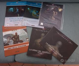 Vendo Scatola Base di Numenera GDR completa, con mappa, manuale base e schede + Manuale Guida al Nono Mondo + Manuale Bestiario del Nono Mondo + Manuale Compendio della Tecnologia + Manuali Opzioni del Personaggio 1 e 2 + Libro Mappe del Nono Mondo + Libro di Avventure La Spina del Diavolo + Espansioni aggiuntive Collezione di Crypto 1, Al di là di Tutti i Mondi, Amore e Sesso nel Nono Mondo, Libro delle Avventure. Alcuni letti e poco utilizzato altri nuovi e riposti in libreria. (Valore di 288 euro)
