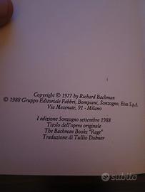 Questa è la prima edizione italiana Sonzogno – settembre 1988, traduzione di Tullio Dobner, tratta dall’opera originale Rage. Un titolo che ha fatto discutere, tanto da diventare un vero oggetto da collezione per appassionati di King e per chi cerca libri fuori catalogo e introvabili