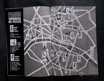 Una bellissima pubblicazione vintage in condizioni eccellenti e molto rara (non ne esiste nessuna altra copia in commercio e non ci sono informazioni reperibili al riguardo): si tratta di uno straordinario documento d’epoca, con fotografie di alta qualità e accurati testi redazionali, che fornisce una panoramica sulla vita notturna della “peccaminosa” Parigi, inclusa una mappa dei luoghi di perdizione della città. Dal momento che la pubblicazione è priva sia di indicazioni editoriali che di un prezzo di vendita, si tratta con tutta probabilità di materiale fuori commercio distribuito in occasione di una serie di documentari INCOM (Le grandi città), realizzati sulla scorta del successo del celebre film di Alessandro Blasetti EUROPA DI NOTTE (1959). Per questo motivo riteniamo quindi che la datazione sia sicuramente da attribuire alla prima metà degli anni ‘60, dal momento che il rotocalco cinematografico chiuse i battenti nel 1965. Sono disponibili anche le altre pubblicazioni dedicate a Londra, Berlino e Barcellona, altrettanto belle e rare.