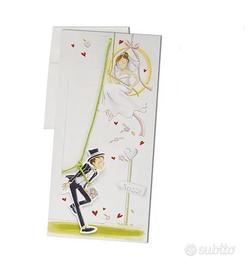 Partecipazione nozze spiritosa, fai da te, la sposa tira lo sposo verso l'alto. Modello fai da te, cartoncino interno si tira in alto e si estrae come da foto. Automontante, completo di cordoncino verde.
