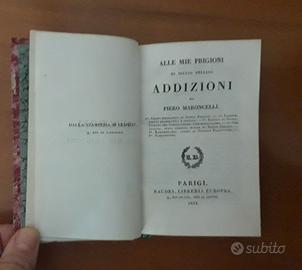 2) ADDIZIONI alle "Mie Prigioni" con cenni biografici di Pellico, ecc,. di Piero Maroncelli, Baudry, Parigi, 1834, Legatura in mezza pelle, titolo in oro al dorso, 10x15 cm, LXVIII+180 pagine.