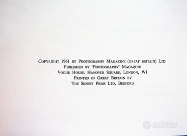 Photography Year Book 1962 Hall Norman Libro fotografico da collezione Il libro hardcover è in ottime condizioni ma la copertina frontale ha un segno di biro e sul retro un pezzo mancante. Il libro misura 21x27,2x1,6 cm e pesa 918 grammi. Contiene 220 pagine, 7 famosi fotografi e decine di altri. Foto a tutta pagina ed a pagina doppia. The "Photography Year Book 1962" is a hardback book written by Norman Hall and published by Photography Magazine. It is a non-fiction book about photography, making it a valuable collectible for photography enthusiasts. The book is in its original form, providing readers with a glimpse into the world of photography in 1962 through insightful articles, images, and perspectives. This edition captures a snapshot of the photography industry during that time, offering a unique insight into the evolution of photography as an art form (AI description)