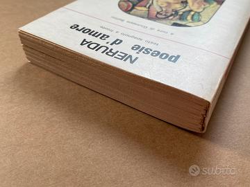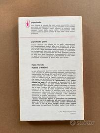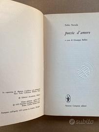 "Poesie d'amore" di Pablo Neruda, con testo spagnolo a fronte, a cura di Giuseppe Bellini, prima edizione aprile 1975 Newton Compton Editori - Paperbacks Poeti, copertina flessibile. A parte i segni del tempo, pari al nuovo. E' una celebre antologia, un classico per chi cerca una raccolta rappresentativa del Neruda amoroso che raccoglie i componimenti più passionali del poeta cileno.