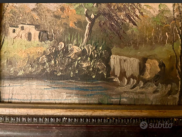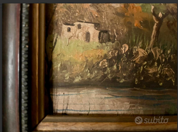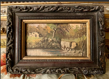 PREGIATO dipinto olio su tela raffigurante "PAESAGGIO RURALE CON FIUME", racchiuso in cornice d'epoca, finemente intagliata. ANTICO riconducibile fine '800. CONDIZIONI: ottimo stato conservativo ma essendo un articolo antico/vintage può presentare i lievi segni del tempo che ne attestano l'originalità e il fascino. Proveniente da collezione privata Villa Veneta del '900. MISURE: L22xh16xp2cm DETTAGLI: Questo dipinto a olio rappresenta una scena pastorale tipica della tradizione pittorica europea del XIX° secolo. L'opera raffigura un paesaggio rurale con fiume, alberi autunnali, una casa colonica sullo sfondo. La cornice ornata in legno intagliato con motivi floreali è caratteristica del periodo vittoriano.