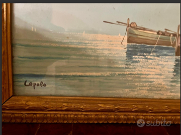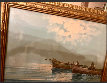 MAESTOSO e PREGIATO dipinto ad olio su tela raffigurante "SCENA MARINA con BARCHE" FIRMATO racchiuso in PREZIOSA cornice dorata. ANTICO riconducibile alla fine del XIX secolo. CONDIZIONI: ottimo stato conservativo ma essendo un articolo antico/vintage può presentare i lievi segni del tempo che ne attestano l'originalità e il fascino. Proveniente da collezione privata Villa Veneta del '900. MISURE: L48xh39cm c.a. DETTAGLI: Questo dipinto rappresenta una scena marina tranquilla, con barche ormeggiate in acque calme, probabilente ambientata lungo la costa italiana o mediterranea. Lo stile e la tecnica pittorica suggeriscono un'opera realizzata tra la fine del XIX secolo e l'inizio del XX secolo.