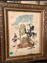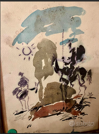 PREZIOSO e RICERCATO disegno a colori opera "OMAGGIO a PICASSO" FIRMATO, raffigurante Don CHISCIOTTE. La rappresentazione è stilizzata con pennellate gestuali e colori vivaci ANTICO riconducibile ai primi del 900. CONDIZIONI: ottimo stato conservativo ma essendo un articolo antico/vintage può presentare i lievi segni del tempo che ne attestano l'originalità e il fascino. Proveniente da collezione privata Villa Veneta del '900. MISURE: L30xh37xp2cm c.a. DETTAGLI: Quest'opera rappresenta Don Chisciotte, il leggendario personaggio letterario creato da Miguel deCervantes nel XVII secolo.