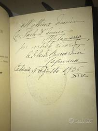 Prime Novelle (edizione del 1899) con dedica dell'autrice Adelaide Bernardini Capuana (scrittrice, poetessa e drammaturga italiana, nonché autrice di testi di critica letteraria e moglie del celebre Luigi Capuana) datata 5 Agosto 1936. La rilegatura è ancora in buono stato e il libro è fruibile per la lettura senza difficoltà nel girare le pagine, nessuna di esse inoltre è strappata, sgualcita o mancante.