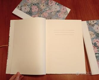 Tre quaderni ricoperti con carta decorata fine e con nastro di chiusura. All'intenro pagine interamente bianche. Misure 24,5 x 35 cm, altezza 2 cm. Uno dei quaderni è ancora sigillato. Prezzo valido per l'acquisto di tutti i 3 libri. In perfetto stato. Possibilità di spedizione o di consegna a Gaggiano e limitrofi. Il ricavato verrà devoluto a scopo benefico.