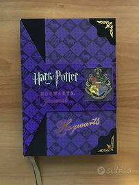 Il quaderno journal è nuovo, mai usato, ancora nell’ imballo originale e protettivo. É della marca “the noble collection”, azienda che crea gadget da collezione di ottima qualità e bellezza di tutti i principali franchise. Il journal ha la copertina rigida viola e nera, il bordo delle pagine dorato, la fibbia in metallo per la chiusura con i loghi delle case a colori, si chiude con un elastico nero e ha 2 segna pagina, oro e viola.