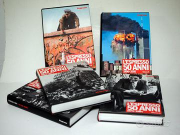 RACCOLTA L'ESPRESSO 50 ANNI 5 VOLUMI Cinque volumi : 1 (1955-1964) , 2 ( 1965-1974) , 3 ( 1975-1984 ) , 4 ( 1985-1995 ) . 5 ( 1996- 2005 ) Prefazione di Nello Ajello - Nota del curatore Francesco Erbani - I Volume pagine n. 589 - II Volume pagine n. 602 - III IV V Volume pagine n. 607 per un totale di pagine n. 3.022 - cm. 28 x 20 - In ogni volume indice dei nomi e fonti fotografiche - Indice per ogni volume: Interni - Mondo - Cronaca - Economia - Cultura - Spettacoli - Costume - Introduzione di Nello Ajello - Cronologia degli eventi più rilevanti in ogni volume - Un migliaio circa di foto in bianco e nero e un centinaio circa a colori, alcune a intera pagina