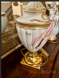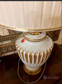 SPETTACOLARE e RAFFINATA coppia di lampade da tavolo/abatjour firmate CARPIE' ceramiche di BASSANO, stile MID-CENTURY. Vintage/antiche riconducibili agli anni '60, esattamente: 1. Lampada da tavolo in porcellana/ceramica con eleganti decorazioni applicate a mano e finiture dorate, paralume tinta avorio 2. Lampada da tavolo in porcellana/ceramica bianca con decorazioni dorata e paralume plissettato tinta avorio. Design con corpo a orma di urna con scanalature verticali e dettagli dorati. CONDIZIONI: ottimo stato conservativo, funzionati, ma essendo un articolo antico/vintage può presentare i lievi segni del tempo che ne attestano l'originalità e il fascino. Proveniente da collezione privata Villa Veneta del '900. MISURE: L. 25xh48cm c.a