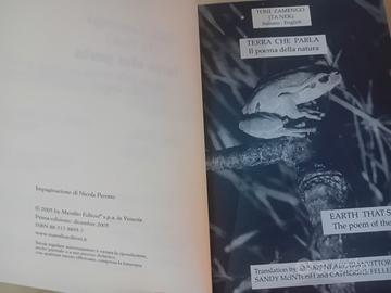 Volume ricercato di "Terra che Parla-Poema della Natura in 12 Lingue",opera firmata da Toni Zamengo,pubblicata da Marsilio Editori nel 2005,gioiello della letteratura Multilingue e tributo universale alla natura,libro fuori catalogo da anni,pagine 272,copertina morbida,ottime condizioni generali pari al nuovo,spedizione accurata.