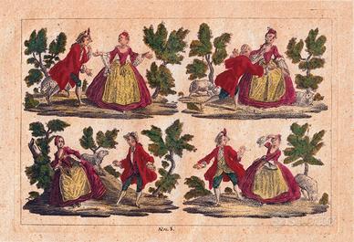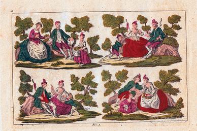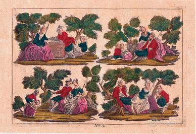 - Nota: ogni stampa è suddivisa in quattro scenette nella quale ricorrono giardini, giochi, incontri, conversazioni.
