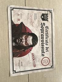 Rivista e attestato del sopravvissuto di Vampire Survivors creati in esclusiva per Lucca comics 2025. L’attestato si poteva ottenere solo trovando dei sticker sparsi per la città. In buone condizioni, un po’ sciupato dal viaggio