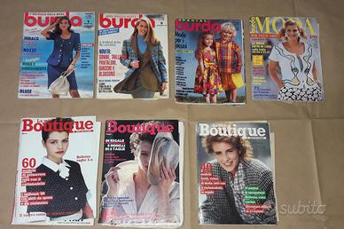 Vendo vecchi numeri di riviste di moda, di cucito e uncinetto, sono inclusi anche molti cartamodello: -Alta moda, 1992 Primavera-estate -Bella, febbraio 1979 -Bella, aprile 1979 -Tutto Uncinetto, Giugno 1981 -A scuola di uncinetto, Gennaio 1990 -Burda, settembre 1992 -Burda Special, primavera/estate 1993 -Burda Moda, primavera 1992 -Burda, Maggio 1994 -La mia Boutique, Ottobre 1986 -La mia Boutique, Marzo 1988 -La mia Boutique, Maggio 1992 -Tutto Taglio e cucito N2 -Cento punti ricamo, 1980 -Lavori artistici all'uncinetto 12° -Lavori artistici all'uncinetto 14° -Lavori artistici all'uncinetto 15° -Disegni Filet 5° -Disegni Filet 7° -Disegni Filet 10° -La piccola Diana Lavori a rete, 90/91 -Benissimo Neonato -Tricot Selezione Uncinetto d'arte, Maggio 1990 -Piccolo uncinetto, marzo 1982 -Piccolo uncinetto, marzo 1979 -Magico uncinetto, febbraio 1990 -Raccoglitore Facilissimo Taglia e cuci la tua moda -PuntiGioiello n.100 1989 -PuntiGioiello n.109 1990 -Filet Fantasia Suppl. n.37 Gioco-filo -Uncinetto Filet Suppl. n.35 Gioco-filo -Burda, settembre 1992 (cartamodello A,B,C,D,E,F) -Burda Special, primavera/estate 1993 (A,B,C,D) -Burda Moda, primavera 1992 (cartamodello C-D, + cartamodello pronto) -Burda, Maggio 1994 (cartamodello E-G) -La mia Boutique, Ottobre 1986 (cartamodello non presente) -La mia Boutique, Marzo 1988 (cartamodello A,B,E,F) -La mia Boutique, Maggio 1992 (cartamodello A,B,C,D,E,F, G,H)