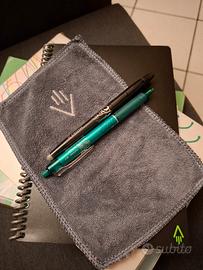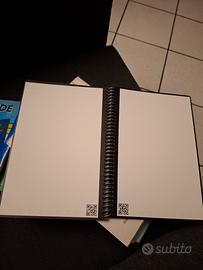 Quaderno smart riutilizzabile all'infinito. Si scrive con la penne Pilot FriXion (incluse, nera e verde, quasi finite), si scansiona la pagina con l'app gratuita (iOS/Android) e si salva tutto su Google Drive, Dropbox, Evernote, email ecc. — poi si cancella con un panno umido e si ricomincia. Pagine in carta sintetica, scrittura fluida, zero spreco di carta. Ottimo per studenti, professionisti, creativi.