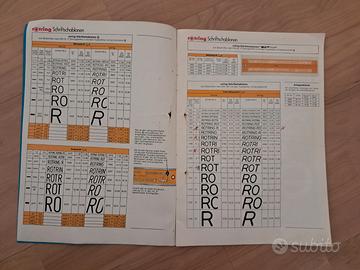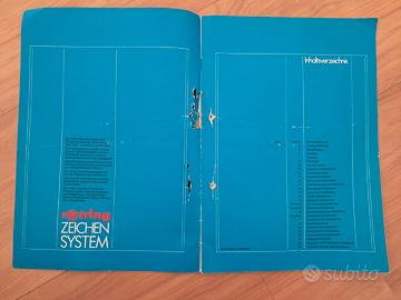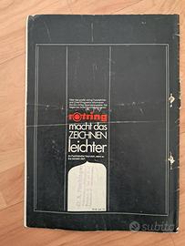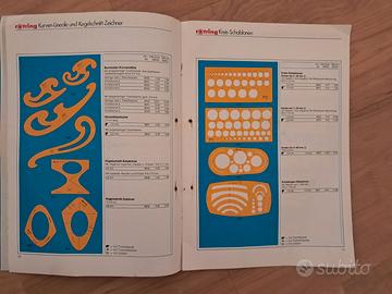 Marca: rOtring, nota per i suoi pennini tecnici (come il Rapidograph) e strumenti di precisione. Contenuto: Questo specifico volume è dedicato alle mascherine da disegno, utilizzate da architetti, ingegneri e grafici prima dell'avvento del disegno assistito dal computer (CAD) per tracciare forme geometriche, simboli tecnici o caratteri tipografici con estrema precisione. Design: L'illustrazione centrale mostra un esempio di mascherina complessa con diverse curve e fori numerati, tipica degli strumenti di misurazione e tracciamento dell'epoca.
