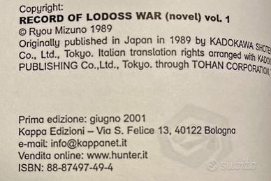 Vendo il primo romanzo della serie "Cronaca della guerra di Lodoss" ("Record of Lodoss War") intitolato "La strega grigia", brossurato, copertina morbida, sovraccoperta, Kappa Edizioni, I edizione giugno 2001, ISBN 9788887497496.