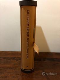 Sacramentarium Episcopi Warmundi (Sacramentario del Vescovo Warmundi). Priuli & Verlucca, Pavone Canavese (Torino), 1990. Il codice, che risale a prima dell’Anno Mille, è conservato presso la Biblioteca Capitolare di Ivrea. Si tratta di un codice membranaceo di 222 fogli, quindi di 444 pagine, con svariate miniature e lettere iniziali auree o policrome. Le miniature rivelano mani diverse, ma hanno in comune i caratteri fondamentali: sono vivacemente disegnate a penna e colorate all’acquerello (verde, rosso, turchino, giallo). Le miniature, o le iniziali decorate, sono racchiuse da cornici, entro cui si snodano iscrizioni illustrative. Se Arduino è famoso nei libri di storia, Warmondo è uomo di pari statura che ha saputo, non solo tenergli testa, ma creare nella città del bellicoso Arduino un centro di cultura tra i più illustri dell’epoca in tutta l’Italia settentrionale. Dell’opera è stata realizzata una fedele riproduzione in anastatica (cm 22×33) che contiene, oltre alla riproduzione delle 444 pagine dell’originale, stampate da 8 a 12 colori, la trascrizione a stampa del manoscritto latino, più una introduzione storica (in italiano, francese ed inglese) a cura di Mons. Luigi Bettazzi, ed un puntuale studio del codice, sempre in tre lingue, realizzato da Luigi Magnani nel 1934 per conto della Biblioteca Apostolica Vaticana. L’opera è rilegata manualmente in piena pelle naturale, con impressioni a secco sui piatti e sul dorso ed è posta in cofanetto con testate in legno e fiancate in pelle con impressioni a secco. La tiratura, rigorosamente numerata, è limitata a 1000 esemplari.
