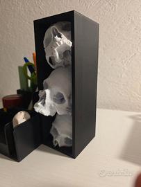 La struttura nera racchiude tre teschi bianchi in rilievo creando un effetto scenografico e minimalista, ideale per ambienti moderni, studio, gaming room o collezioni particolari.