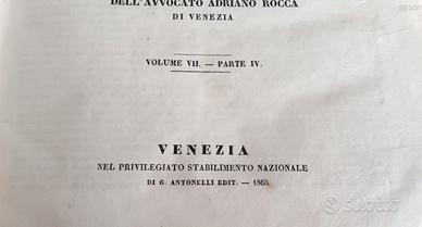 ipubblicazione1847-1859Luogo di stampaVENEZIAAutoreSebire, CarteretEditoriG. Antonelli Edit.Formato29 x 20SoggettoDIRITTODescrizioneRilegatoSovracopertaNoStato di conservazioneAccettabileLegaturaRilegatoDescrizioneOpera incompleta, 9 volumi rilegati in mezza pelle con titoli e fregi in oro al dorso, piatti e dorsi con segni ed usura dovuti da fattore tempo, dorsi altresì interessati da piccoli fori da tarlo, alcuni volumi presentano ai piatti macchie e formazioni da umidità, tagli imbruniti, pagine parimenti imbrunite, testo su due colonne, volumi comunque fruibili, contenenti per ordine alfabetico: le spiegazioni di tutti i termini del diritto e della pratica - un trattato ragionato sopra ciascuna materia - la giurisprudenza delle diverse Corti e del Consiglio di Stato - un sommario delle legislazioni straniere, prima versione italiana corredata di note tratte dai codici vigenti in Italia per cura del Dr. Adriano Rocca di Venezia [volume I] Anno 1847, Vol. I - Parte I, con una nota dell'editore, numero pagine 1602 [volume II] Anno 1849, Vol. I - Parte II, con avvertenze