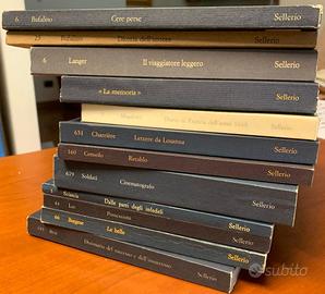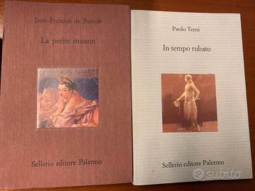 Cedo i seguenti titoli: Lettere di viaggio - Petrarca €5 Massimilla Doni - Balzac €4 Lettera di Francesco Pirani al Signor Generale D. Giovanni Acton - Monti €7 Le petit maison - de Bastide €4 Amore e Psiche - Apuleio €4 Il tempo rubato - Terni €6 Il cane di terracotta - Camilleri €8 Il re delle due Sicilie - Kusniewicz €9 L'elmetto inglese - Baduel €9 La memoria di Elvira - €7 Souvenirs - de Caylus €5 Goethe in Palermo €4 Il pittore felice - Job €5 Come si può - Aguirre D'Amico €4 Sogni di sogni - Tabucchi €3 Cronachette - Sciascia €6 La sentenza memorabile - Sciascia €6 La Palazzina di villeggiatura - Job €6 Incomincia la novella storia - Goethe €7 Paesi lontani - Aguirre D'Amico €5 Il patto col fantasma - James €4 Grammatica italiana - Panzini €4 Il procuratore della Giudea - France €4 Cere perse - Bufalino €13 Diceria dell'untore - Bufalino €13 Il viaggiatore leggero - Langer €20 La memoria (prime 200 copertine della raccolta Memoria) €15 Diario di Francia dell'anno 1668 - Magalotti €12 Lettere di Losanna - de Charriere €14 Retablo - Consolo €11 Cinematografo - Soldati €18 Dalle parti degli infedeli - Sciascia €13 Possessioni - Lee €14 Le belle - Borghese €16 Diario del successo dell'insuccesso e del luoghi comuni - Brin €15 Il violino di Faenza - Champfleury €30 Il sottotenente Summenzionato - Tynjanov €25 Il rosso e il rosa - Margravia di Bareith €21 Piccole impertinenze - F. Pirandello €27 Osteria dei pittori - Pirro €25 Con Savinio - Savinio €24 Parigi 1789 - Galateria €22 Cose viste 1938-1939 - Brin €18 Usi e costumi 1920-1940 - Brin €18 la seduzione nel Celeste Impero - €15 Il dottor Bilob - Bonaviri €10 Moglie di Verlaine - Mauté €12 Elisa - Ferrero €5 La notte e il momento - Crébillon fils €6 Per blocchi da 10 pezzi in su sconto del 25%